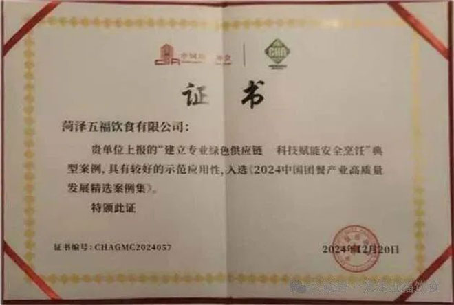 • “2024年度中國團餐領跑者TOP300”榮譽稱號